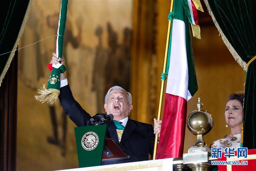 9月15日,在墨西哥首都墨西哥城中心的国家宫,墨西哥总统洛佩斯(左)出席庆祝墨西哥独立210周年活动。 9月16日是墨西哥独立日。 新华社发(弗朗西斯科·卡涅多摄)