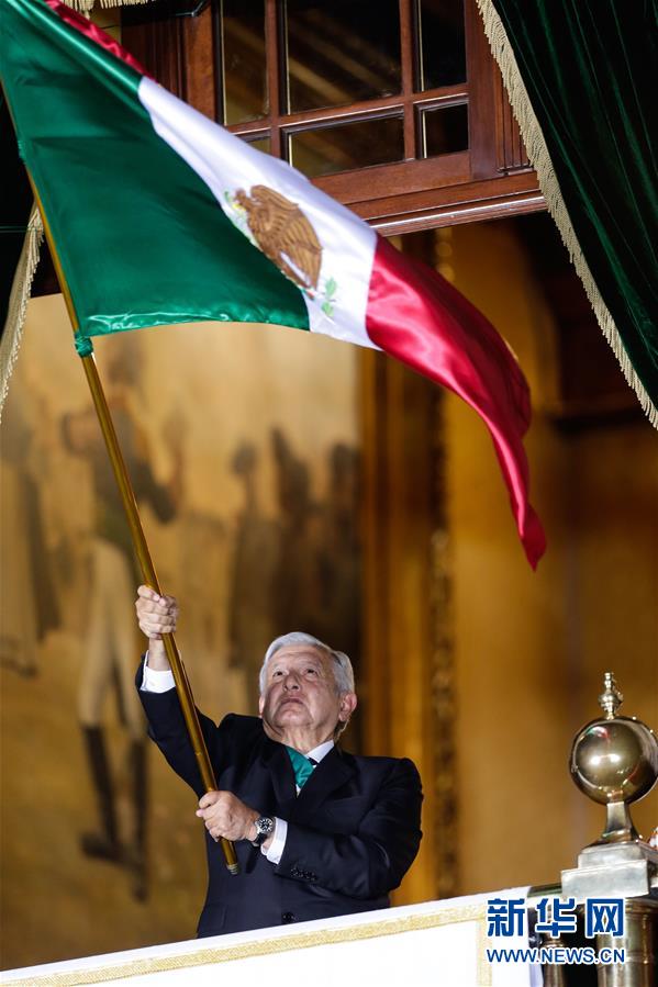 9月15日,在墨西哥首都墨西哥城中心的国家宫,墨西哥总统洛佩斯在庆祝墨西哥独立210周年活动上挥舞国旗。 9月16日是墨西哥独立日。 新华社发(弗朗西斯科·卡涅多摄)