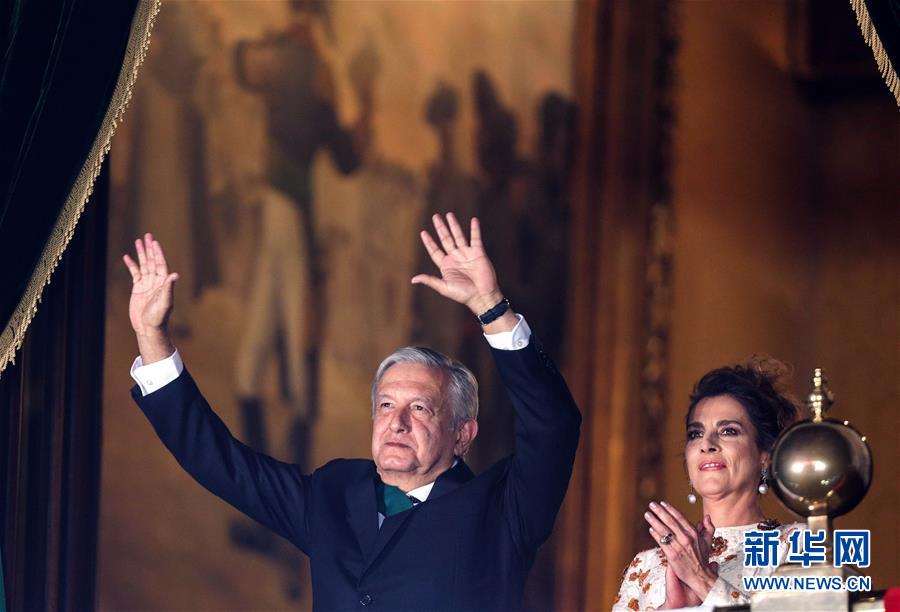 9月15日,在墨西哥首都墨西哥城中心的国家宫,墨西哥总统洛佩斯(左)出席庆祝墨西哥独立210周年活动。 9月16日是墨西哥独立日。 新华社发(弗朗西斯科·卡涅多摄)