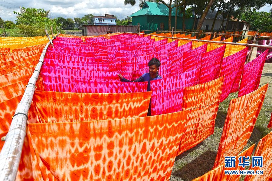 9月15日,在孟加拉国纳拉扬甘杰地区,当地村民将手工印染后的布匹进行晾晒。 在孟加拉国中部的纳拉扬甘杰地区,当地村庄还保留着手工印染的工艺。 新华社发(萨利姆摄)