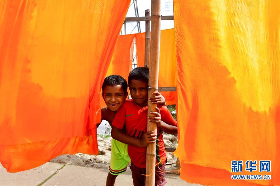 9月15日,在孟加拉国纳拉扬甘杰地区,两名儿童站在晾晒的布匹旁。 在孟加拉国中部的纳拉扬甘杰地区,当地村庄还保留着手工印染的工艺。 新华社发(萨利姆摄)