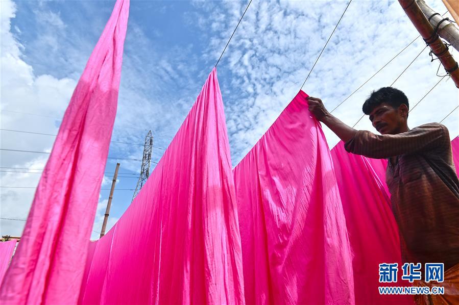 9月15日,在孟加拉国纳拉扬甘杰地区,当地村民将手工印染后的布匹进行晾晒。 在孟加拉国中部的纳拉扬甘杰地区,当地村庄还保留着手工印染的工艺。 新华社发(萨利姆摄)