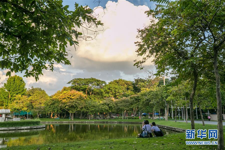 泰国曼谷市区内有大大小小的城市公园,这些都市“绿肺”不仅是曼谷市民休闲锻炼的绝佳场所,也是城市生态平衡的重要一环。曼谷市政府正通过植树以及新建公园的方式扩大市区绿化面积。 这是2020年8月24日,两名学生在泰国曼谷仑披尼公园拍摄云彩。 新华社记者 张可任 摄