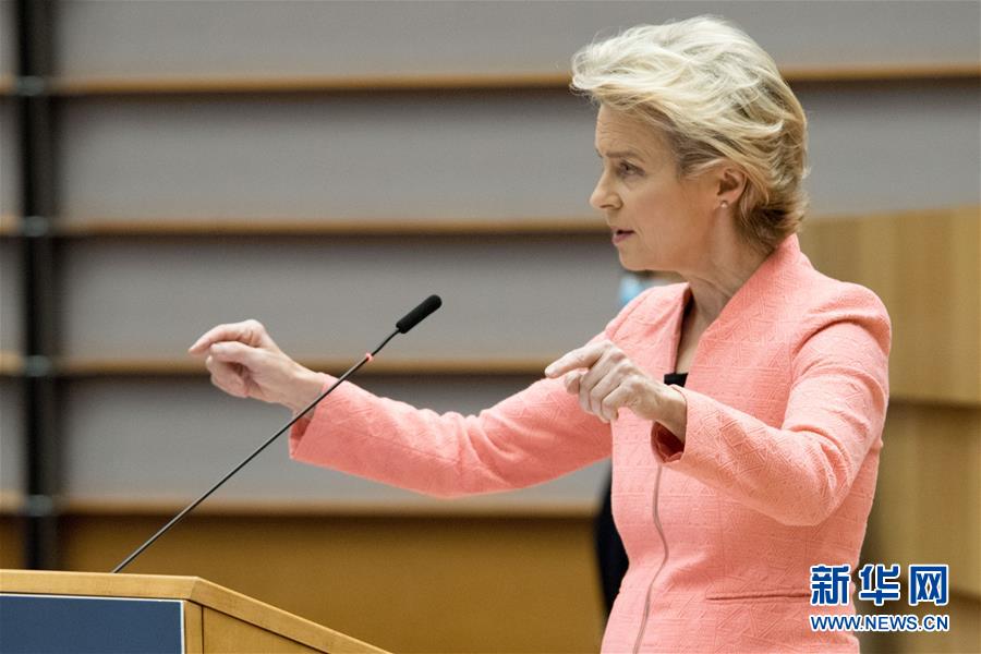 9月16日,在比利时布鲁塞尔,欧盟委员会主席冯德莱恩在欧洲议会发表上任以来的首份年度“盟情咨文”。 欧盟委员会主席冯德莱恩16日在欧洲议会发表“盟情咨文”,提议到2030年时欧盟温室气体排放要比1990年减少55%甚至更多。此前欧盟设定的减排目标是40%。 新华社发