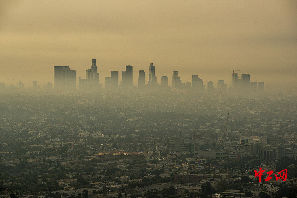 当地时间2020年9月17日,美国加利福尼亚州洛杉矶,在格里菲斯天文台(Griffith Observatory)上可以看到加州熊熊野火产生的大量的烟雾和细小颗粒笼罩在洛杉矶市区,数千英尺高空的烟尘笼罩着太阳。当地公共卫生官员已向居民发出空气质量预警。图片作者:人民视觉