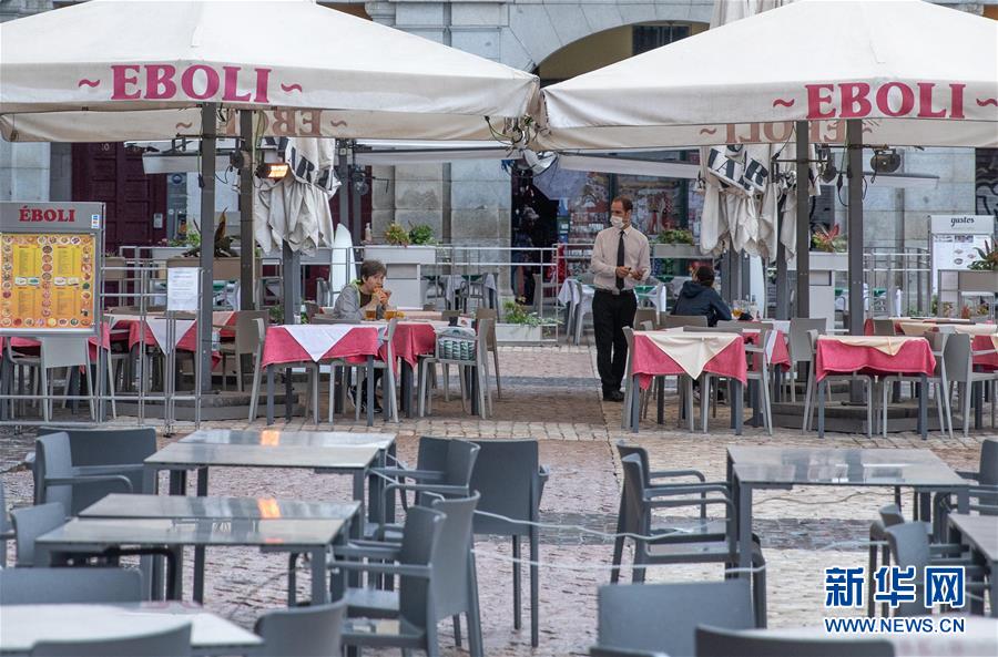 9月18日,西班牙马德里马约尔广场的一家餐馆顾客稀少。 受新冠肺炎疫情影响,西班牙马德里城区内各大旅游景点游客稀少。美国约翰斯·霍普金斯大学19日发布的新冠疫情统计数据显示,西班牙累计新冠确诊病例达640040例。 新华社记者 孟鼎博 摄