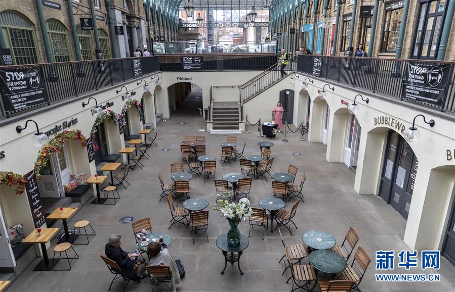 9月21日,人们在英国伦敦市中心的考文特花园就餐。 过去数周,英国每日新增确诊病例数激增。英国卫生大臣汉考克9月20日说,英国当前正处于新冠疫情的“临界点”,如果民众不遵守疫情防控规定,政府可能在全国范围内实施二度“封城”。 新华社记者 韩岩摄