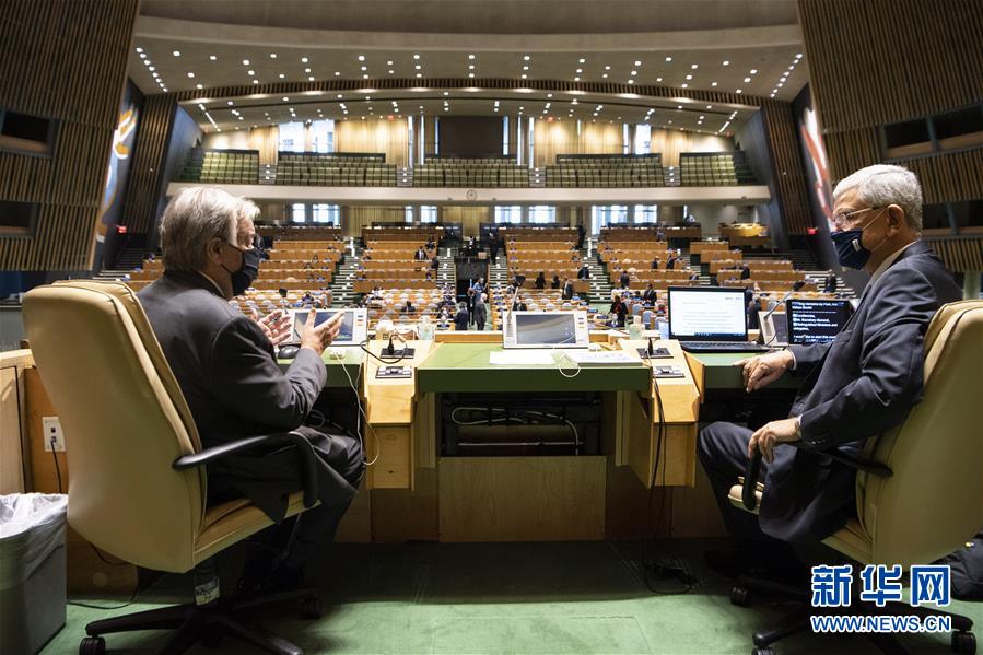 9月21日,在位于纽约的联合国总部举行的联合国成立75周年纪念峰会开始前,联合国秘书长古特雷斯(左)与第75届联合国大会主席博兹克尔交谈。 联合国成立75周年纪念峰会21日举行。与会代表表示,在世界面临诸多威胁与挑战、尤其是新冠肺炎疫情肆虐全球之际,国际社会更需坚持多边主义,加强全球合作。 新华社发(联合国供图/埃瑟金德尔·德贝贝摄)