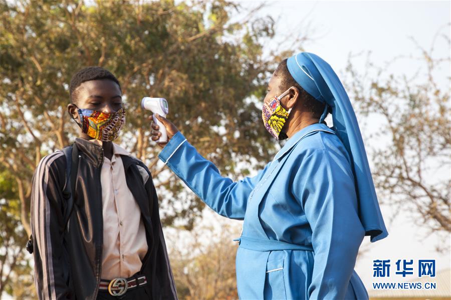 9月21日,在赞比亚首都卢萨卡,一名戴口罩的学生接受体温检测。 赞比亚学校近日开始陆续全面复课。按照防疫要求,返校的学生必须佩戴口罩并保持一定社交距离,学校也配备洗手液等防疫物资供师生使用。 新华社发(马丁·姆班圭塔摄)