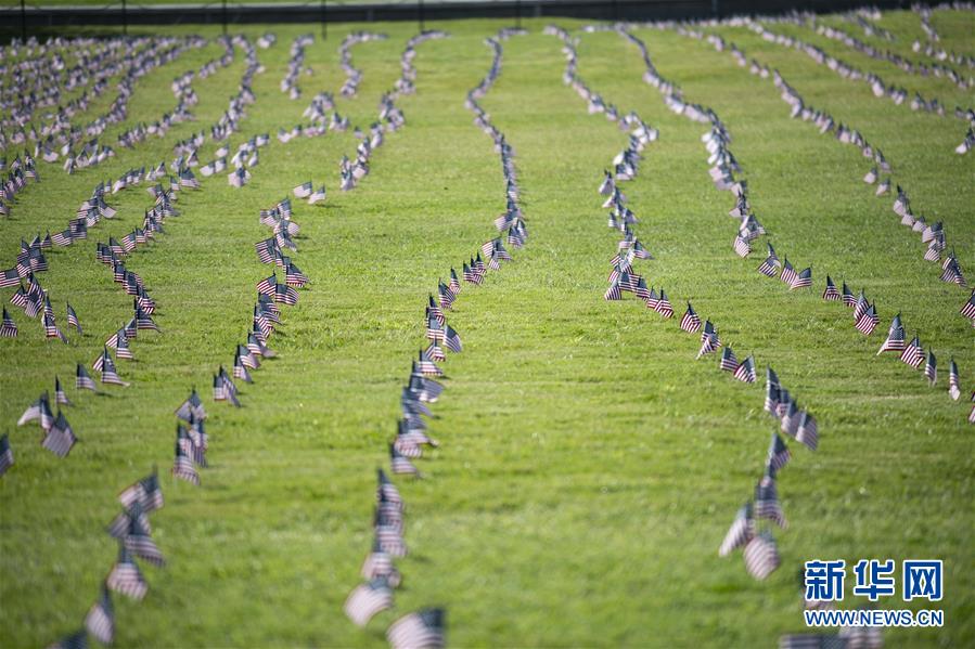 9月22日,在美国首都华盛顿,美国国旗摆放在草坪上悼念新冠逝者。 当日,2万面美国国旗摆放在华盛顿纪念碑附近悼念20万新冠逝者。美国约翰斯·霍普金斯大学22日发布的新冠疫情最新统计数据显示,截至美国东部时间22日11时23分(北京时间23时23分),美国累计新冠死亡病例超过20万例,达200005例,累计确诊病例6861211例。 新华社记者刘杰摄