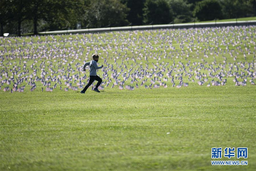 9月22日,在美国首都华盛顿,一名男孩从草坪上的美国国旗旁跑过。 当日,2万面美国国旗摆放在华盛顿纪念碑附近悼念20万新冠逝者。美国约翰斯·霍普金斯大学22日发布的新冠疫情最新统计数据显示,截至美国东部时间22日11时23分(北京时间23时23分),美国累计新冠死亡病例超过20万例,达200005例,累计确诊病例6861211例。 新华社记者刘杰摄