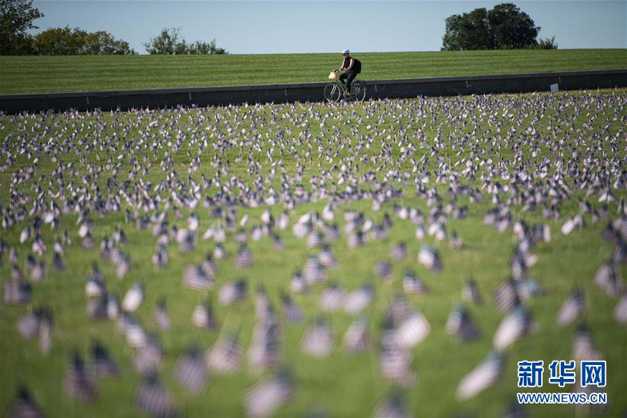 9月22日,在美国首都华盛顿,一名女子骑车从草坪上的美国国旗旁经过。 当日,2万面美国国旗摆放在华盛顿纪念碑附近悼念20万新冠逝者。美国约翰斯·霍普金斯大学22日发布的新冠疫情最新统计数据显示,截至美国东部时间22日11时23分(北京时间23时23分),美国累计新冠死亡病例超过20万例,达200005例,累计确诊病例6861211例。 新华社记者刘杰摄