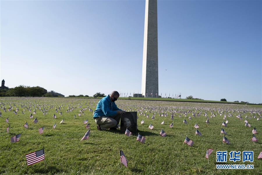 9月22日,在美国首都华盛顿,一名男子手持死于新冠疫情的家人照片悼念。 当日,2万面美国国旗摆放在华盛顿纪念碑附近悼念20万新冠逝者。美国约翰斯·霍普金斯大学22日发布的新冠疫情最新统计数据显示,截至美国东部时间22日11时23分(北京时间23时23分),美国累计新冠死亡病例超过20万例,达200005例,累计确诊病例6861211例。 新华社记者刘杰摄