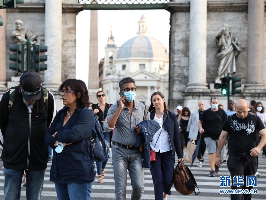 9月22日,人们走在意大利罗马街头。 根据意大利卫生部22日公布的最新统计数据,过去24小时该国新增1392例新冠肺炎确诊病例,累计确诊病例超30万例,达300897例,累计死亡35738例。 新华社记者 程婷婷 摄