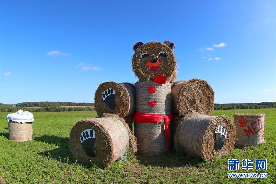 这是9月22日在白俄罗斯首都明斯克郊区拍摄的用干草捆搭建的棕熊造型。 随着白俄罗斯秋收基本结束,各地公路边的田地中出现了用干草捆搭建的各种造型的艺术创作作品,这也是白俄罗斯农民每年庆祝秋收的独特方式之一。 新华社发(任科夫摄)