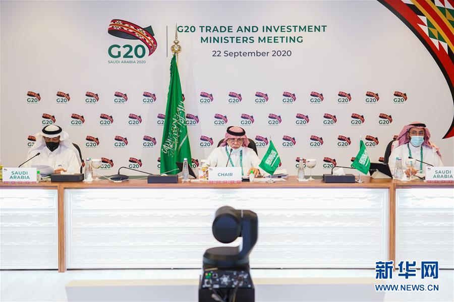 9月22日,在沙特阿拉伯利雅得,沙特商业部大臣马吉德·卡萨比(中)和沙特投资部大臣哈立德·法利赫(左)出席二十国集团贸易和投资部长视频会议。 二十国集团贸易和投资部长22日召开视频会议,承诺继续在减轻新冠疫情影响方面加强协调合作,推动国际贸易与投资复苏,并支持对世界贸易组织进行必要的改革。 新华社发(沙特新闻部供图)