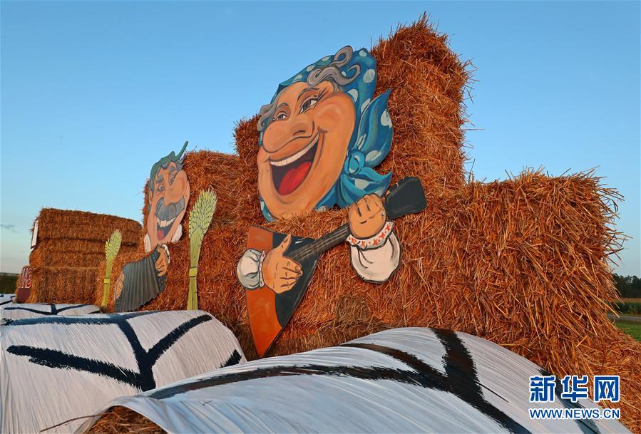 这是9月22日在白俄罗斯首都明斯克郊区拍摄的用干草捆搭建的农民艺术造型。 随着白俄罗斯秋收基本结束,各地公路边的田地中出现了用干草捆搭建的各种造型的艺术创作作品,这也是白俄罗斯农民每年庆祝秋收的独特方式之一。 新华社发(任科夫摄)