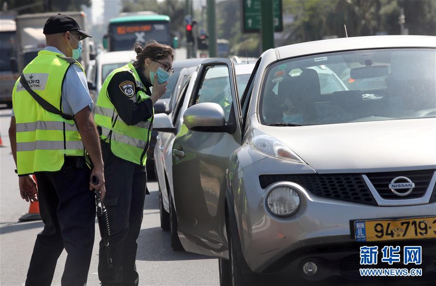 9月23日,在以色列特拉维夫,警察在一处检查站执行“封城”任务。 以色列卫生部23日报告新增新冠确诊病例6667例,创该国自疫情暴发以来单日新高,累计确诊达200041例。 新华社/基尼图片社