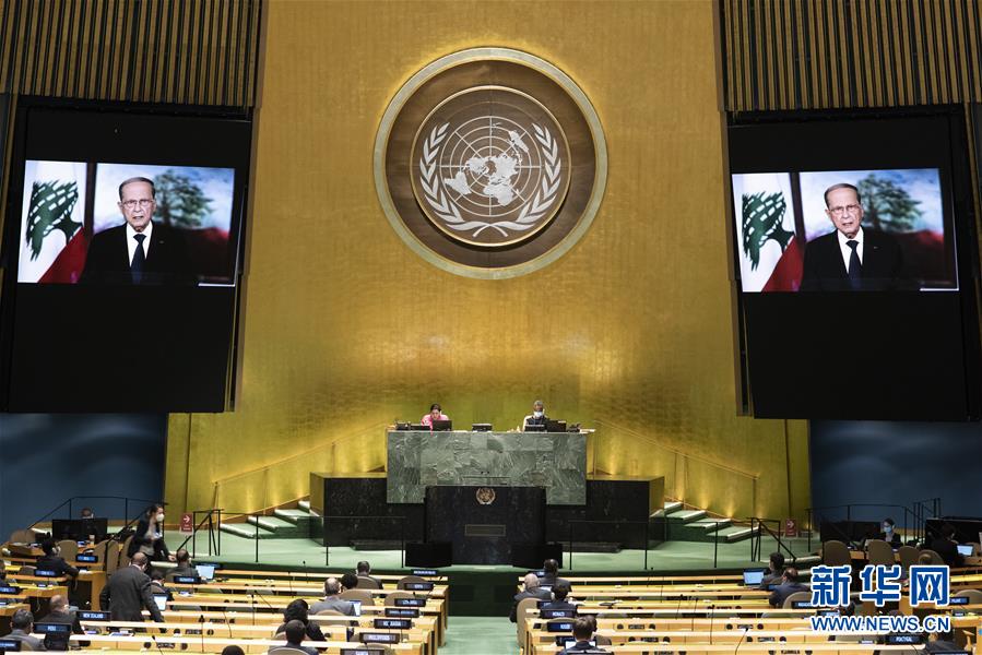 9月23日,在位于纽约的联合国总部,黎巴嫩总统米歇尔·奥恩发表视频讲话。