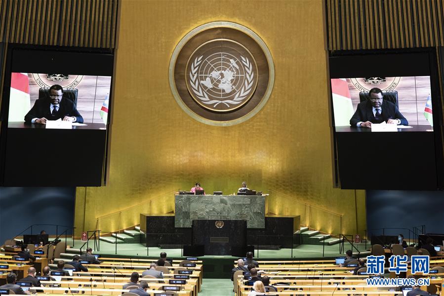 9月23日,在位于纽约的联合国总部,纳米比亚总统哈格·根哥布发表视频讲话。新华社发(联合国供图/埃文·施奈德摄)