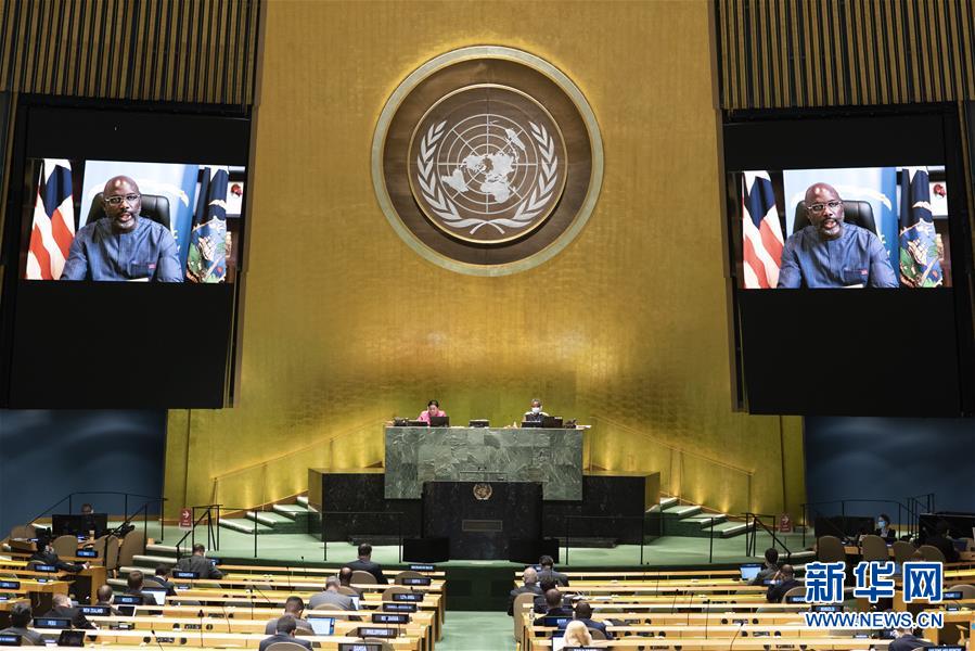9月23日,在位于纽约的联合国总部,利比里亚总统维阿发表视频讲话。新华社发(联合国供图/埃文·施奈德摄)