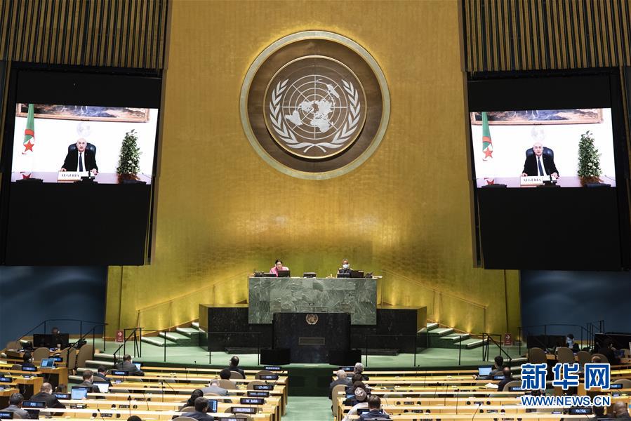 9月23日,在位于纽约的联合国总部,阿尔及利亚总统特本发表视频讲话。新华社发(联合国供图/埃文·施奈德摄)
