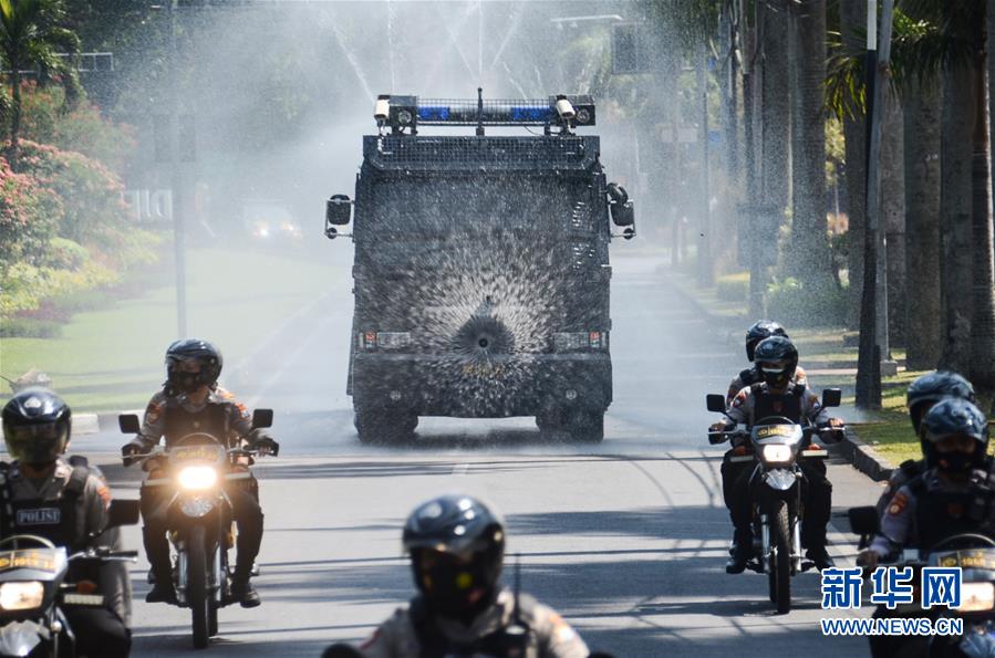 9月26日,警用车辆在印度尼西亚东爪哇省玛琅的街道上喷洒消毒液。 印度尼西亚卫生部当日表示,该国单日新增新冠确诊病例4494例,累计确诊271339例。 新华社发(阿迪蒂亚·亨德拉摄)
