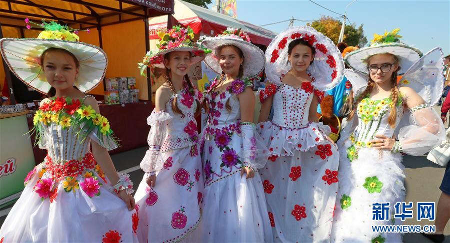 9月26日,在白俄罗斯首都明斯克郊区,几名女孩身着色彩鲜艳的服饰参加农业展销节。 随着当地秋收的基本结束,白俄罗斯各地相继举办农业展销节等活动,欢庆秋收。 新华社发(任科夫摄)