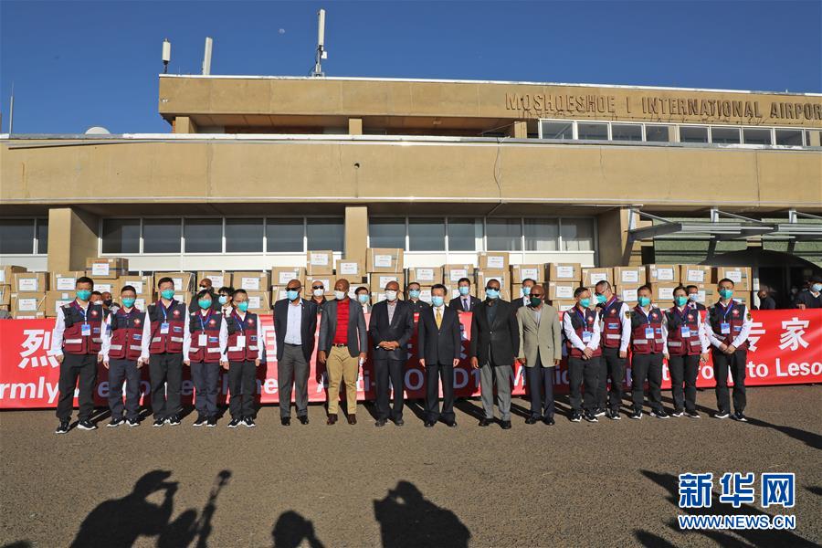 9月27日,在莱索托首都马塞卢的国际机场,莱方官员与中国抗疫医疗专家组合影。 应莱索托政府邀请,中国政府抗疫医疗专家组一行10人于27日乘包机抵达莱索托首都马塞卢,开始对莱索托开展为期10天的抗击新冠疫情援助工作。 新华社发