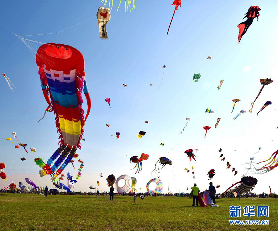 9月26日,来自全国1100多名风筝爱好者及各界嘉宾齐聚位于渤海之滨的世界风筝之都——山东潍坊,参加这里举办的第37届潍坊国际风筝节开幕式。在放飞场上,伴着大海的波涛,蓝天白云之下,充满创意的风筝争奇斗艳、交相辉映,形成了一片“风筝海洋”。新华网发 常武摄