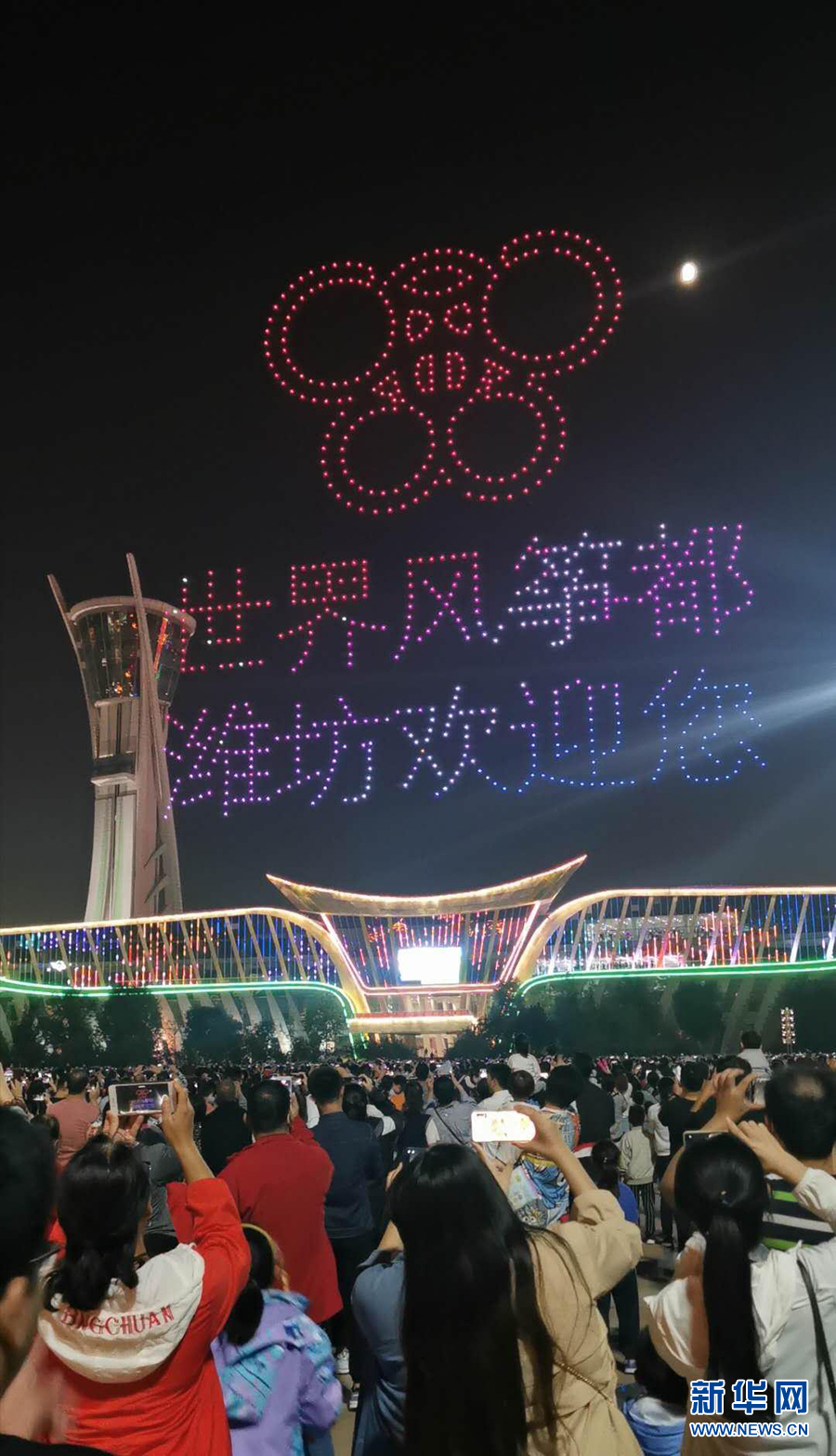 人们在潍坊人民广场观看无人机编队表演。新华网发 常武摄