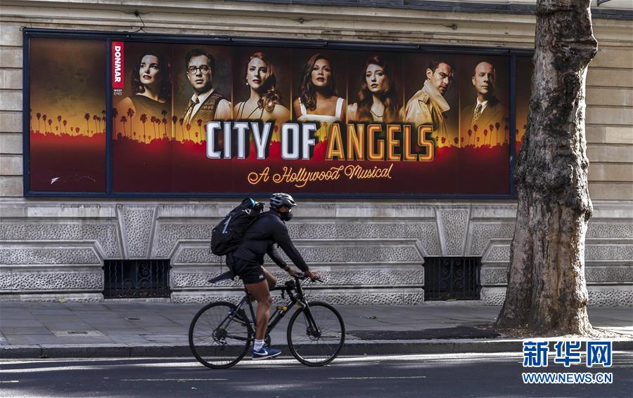 9月28日,一名男子骑车从英国伦敦西区的音乐剧广告前经过。 英国政府28日宣布,将在该国疫情反弹较严重的部分地区加强防控,不遵守防控规定将被视作违法。 新华社记者韩岩摄