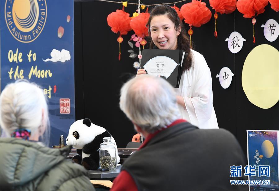 9月30日,在新西兰首都惠灵顿的下哈特图书馆,惠灵顿中国文化中心老师张岚向当地中国文化爱好者讲中国茶文化。 在中国国庆、中秋双节到来之际,“月满四川·中秋文化工坊”9月30日走进新西兰首都惠灵顿的下哈特图书馆。 新华社记者 郭磊 摄