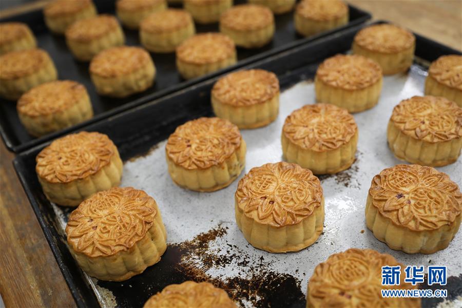 这是9月30日在日本横滨菜香食品公司拍摄的月饼。 中秋节到来之际,日本横滨的菜香食品公司制作了许多蛋黄月饼,以蛋黄象征圆月,迎接中秋佳节。 新华社记者 杜潇逸 摄