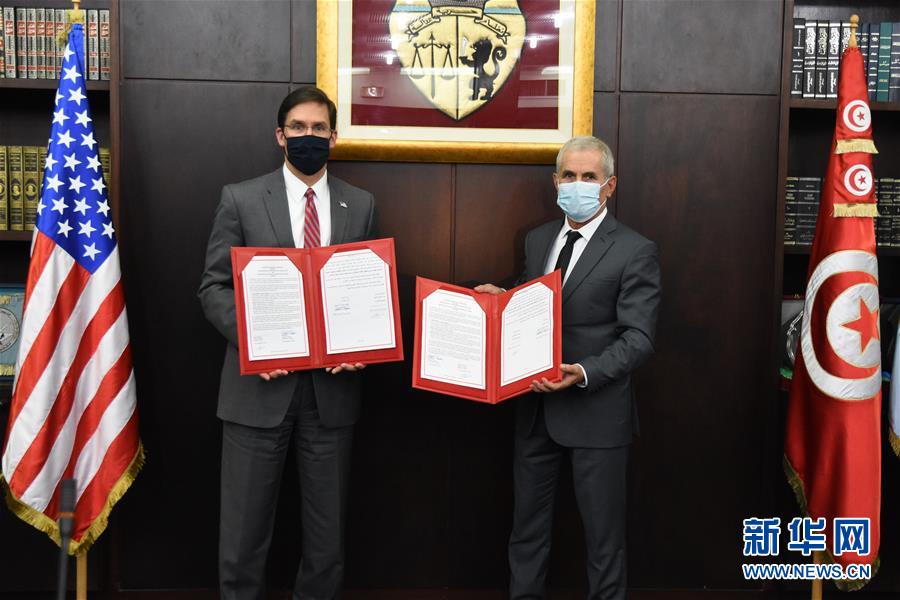 9月30日,在突尼斯首都突尼斯市,突尼斯国防部长巴尔塔吉(右)与来访的美国国防部长埃斯珀签署军事合作路线图后合影。 突尼斯总统赛义德30日会见到访的美国国防部长埃斯珀,双方讨论了反恐合作及利比亚危机等问题。当日,埃斯珀还与突尼斯国防部长巴尔塔吉签署2020年至2030年两国军事合作路线图,以提升突尼斯应对地区威胁的能力。 新华社发(阿代尔摄)
