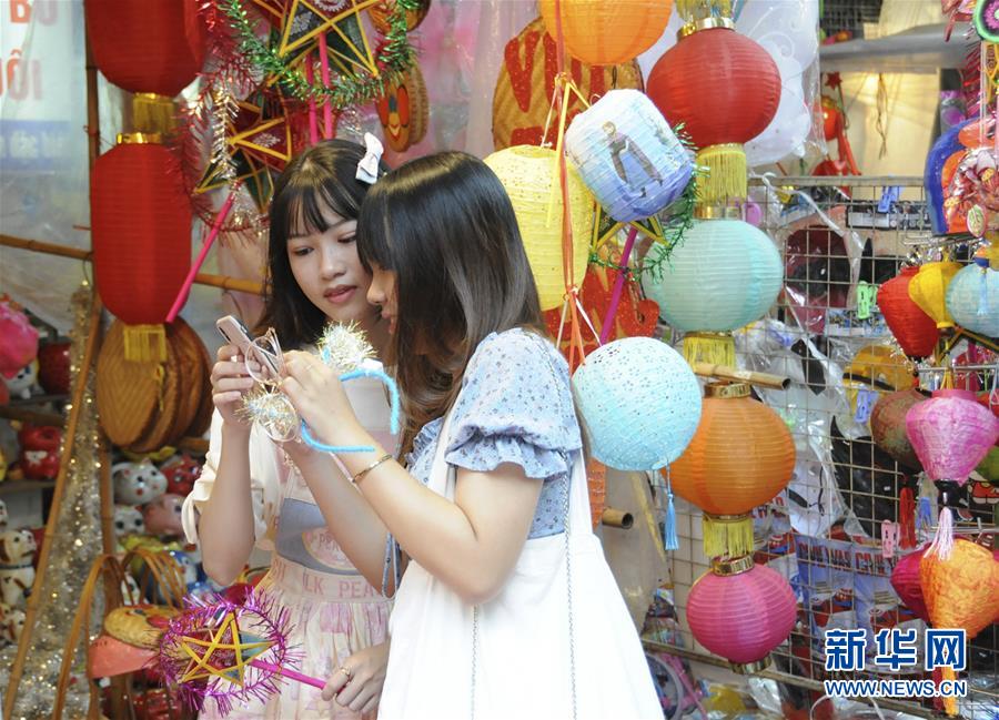 10月1日,女青年在越南首都河内古街区的节日礼品商铺前拍照。灯笼是越南中秋节的特色装饰物。 农历八月十五是越南中秋节,也是当地儿童和青年们的节日。依照习俗,人们会给孩子们赠送各种玩具、饰品和零食。今年节日期间,河内古街区热闹非凡,各式礼品装饰品摊位吸引市民前来休闲、购物。 新华社记者 陶军 摄