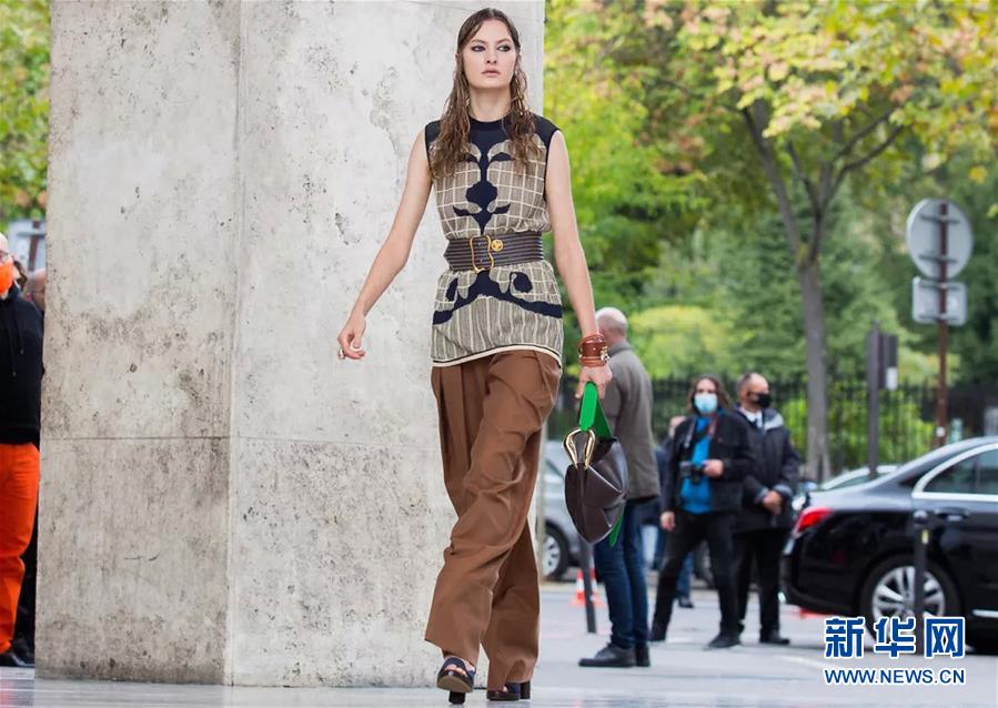 10月1日,模特在法国巴黎时装周上展示CHLOE品牌2021春夏新品成衣。 新华社发(皮耶罗·比亚西翁 摄)