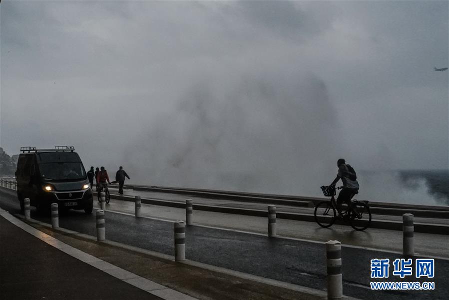 这是10月2日在法国南部城市尼斯拍摄的暴风雨来临的景象。 法国东南部滨海阿尔卑斯省等地2日起遭遇暴风雨袭击,引发的洪水造成桥梁倒塌、道路被毁、房屋受损及大面积停电,目前已有18人失踪,其中包括2名救援人员。 新华社发(塞尔日·阿乌齐 摄)