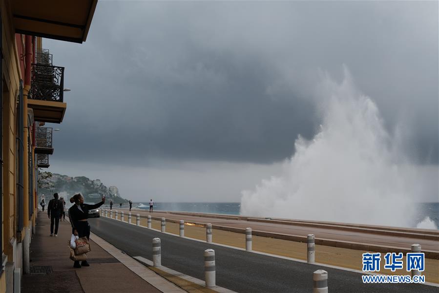 这是10月2日在法国南部城市尼斯拍摄的暴风雨来临的景象。 法国东南部滨海阿尔卑斯省等地2日起遭遇暴风雨袭击,引发的洪水造成桥梁倒塌、道路被毁、房屋受损及大面积停电,目前已有18人失踪,其中包括2名救援人员。 新华社发(塞尔日·阿乌齐 摄)