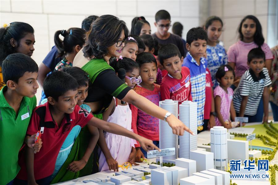 这是2019年10月5日,当地儿童在斯里兰卡科伦坡港口城项目部的展厅参观。 新华社记者 唐璐 摄
