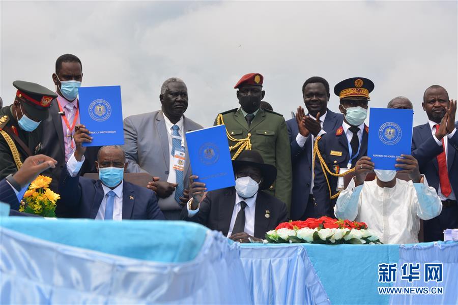 10月3日,在南苏丹首都朱巴,苏丹主权委员会主席布尔汉、南苏丹总统基尔和乍得总统代比(前排左至右)展示最终和平协议。 苏丹过渡政府与反政府武装3日在南苏丹首都朱巴签署最终和平协议,以结束长达17年的敌对状态。 新华社发(戴尼斯 摄)