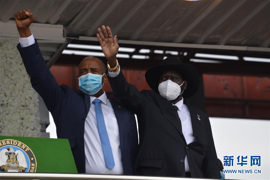 10月3日,在南苏丹首都朱巴,苏丹主权委员会主席布尔汉(左)同南苏丹总统基尔在最终和平协议签署仪式现场向人群致意。 苏丹过渡政府与反政府武装3日在南苏丹首都朱巴签署最终和平协议,以结束长达17年的敌对状态。 新华社发(戴尼斯 摄)