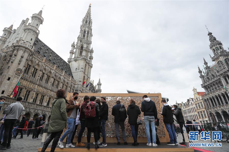 10月3日,在比利时布鲁塞尔大广场,人们取下“正在消失的墙”艺术装置上的木块。 当日,一件名为“正在消失的墙”的艺术装置亮相比利时布鲁塞尔大广场,纪念两徳统一30周年。这件艺术装置包含六千个木块,每个木块上刻有一句名人格言。随着过往的人们将木块取走,整件装置最终将剩下一件透明的框架,以此表达“墙会消失”的理念。 新华社记者郑焕松摄