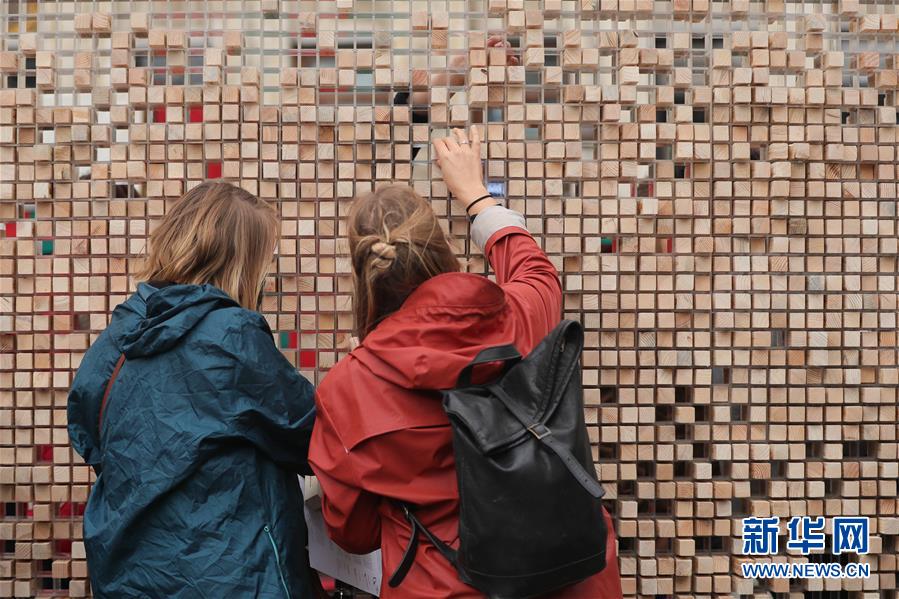 10月3日,在比利时布鲁塞尔大广场,人们取下“正在消失的墙”艺术装置上的木块。 当日,一件名为“正在消失的墙”的艺术装置亮相比利时布鲁塞尔大广场,纪念两徳统一30周年。这件艺术装置包含六千个木块,每个木块上刻有一句名人格言。随着过往的人们将木块取走,整件装置最终将剩下一件透明的框架,以此表达“墙会消失”的理念。 新华社记者郑焕松摄