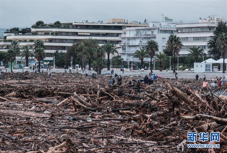 这是10月4日在法国尼斯附近的圣洛朗迪瓦尔拍摄的暴风雨袭击后的海滩。 法国东南部滨海阿尔卑斯省等地2日起遭遇暴风雨袭击,引发的洪水造成桥梁倒塌、道路被毁、房屋受损及大面积停电。据当地媒体报道,洪水已造成至少2人死亡。 新华社发(塞尔日·阿乌齐摄)