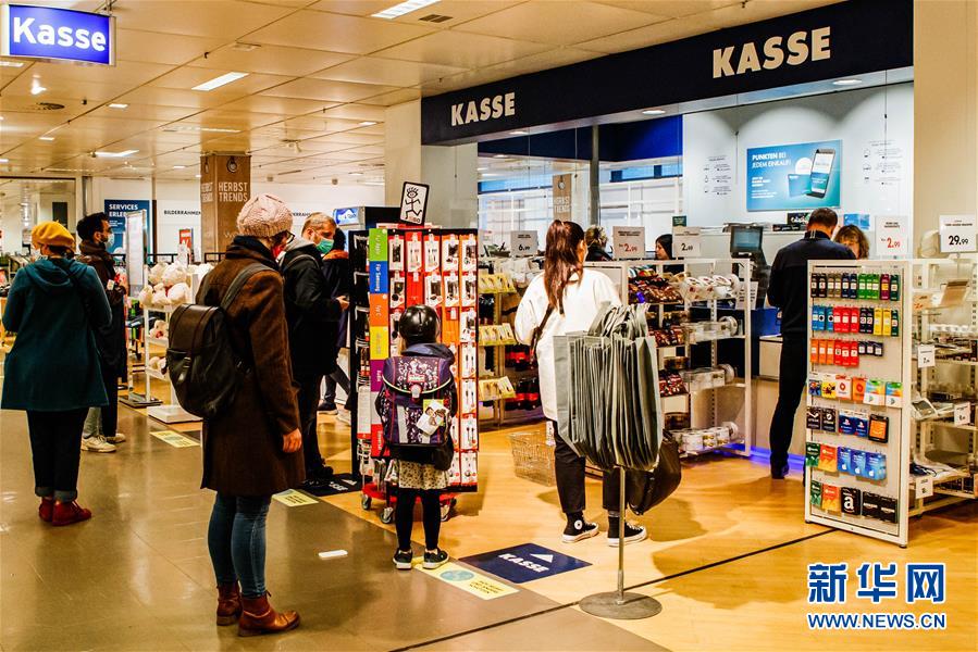 10月5日,在德国首都柏林的一家商场,顾客排队等待结账。 德国疾控机构罗伯特·科赫研究所5日公布的新冠疫情数据显示,截至当天零时,德国累计新冠确诊病例300619例,其中尚未治愈27385例。首都柏林主城区3个区域疫情超过“警戒线”,将面临更严格的防疫措施。 新华社发(张平摄)
