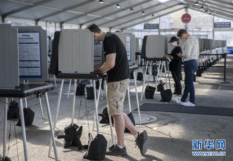 10月5日,美国旧金山选民在旧金山市政厅户外投票中心填写选票参加提前投票。 为防范新冠疫情,美国旧金山在市政厅外设立户外投票中心,从当地时间10月5日开始为参加美国大选的选民提供服务。 新华社发(李建国摄)