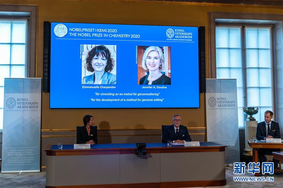 10月7日,在瑞典斯德哥尔摩,瑞典皇家科学院公布2020年诺贝尔化学奖获得者。 瑞典皇家科学院7日宣布,将2020年诺贝尔化学奖授予法国女科学家埃玛纽埃勒·沙尔庞捷和美国女科学家珍妮弗·道德纳,以表彰她们在基因组编辑方法研究领域作出的贡献。 新华社发(魏学超摄)
