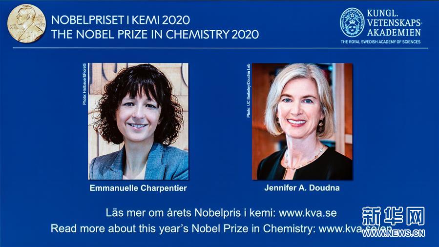 10月7日,在瑞典斯德哥尔摩,瑞典皇家科学院诺奖宣布现场电子屏幕上显示两位获奖的女科学家。 瑞典皇家科学院7日宣布,将2020年诺贝尔化学奖授予法国女科学家埃玛纽埃勒·沙尔庞捷和美国女科学家珍妮弗·道德纳,以表彰她们在基因组编辑方法研究领域作出的贡献。 新华社发(魏学超摄)