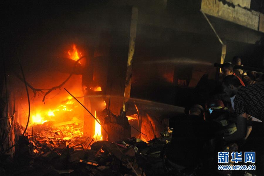 10月9日,人们在黎巴嫩贝鲁特的爆炸现场灭火。 黎巴嫩首都贝鲁特一居民区9日发生储油罐爆炸,造成至少4人死亡、数十人受伤。 新华社发(比拉尔·贾维希摄)